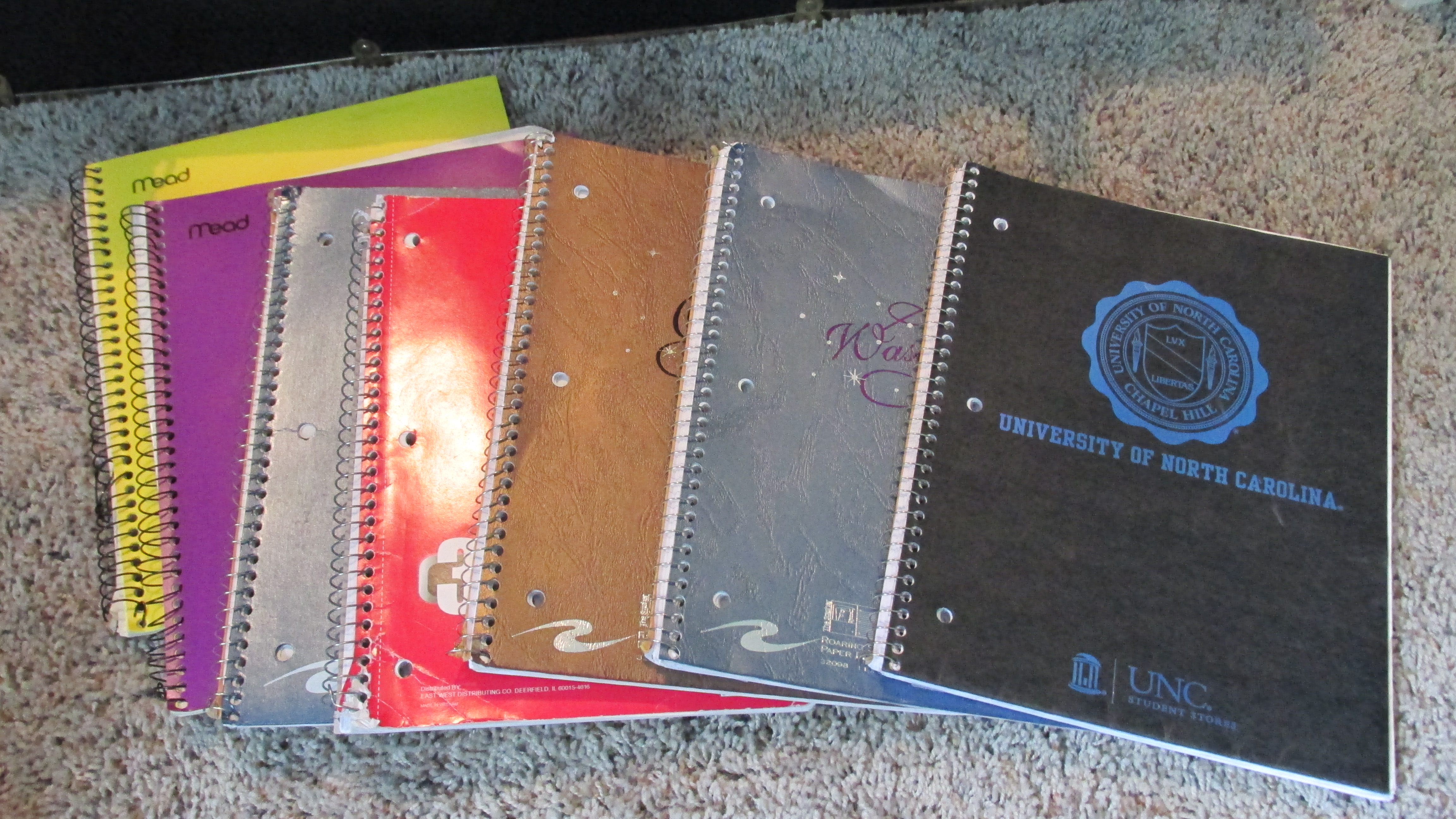 1. keeping a record of what’s happened, mostly in my life (GREAT for winning future arguments with husband), but also in the world (i.e., 9/11, the Arab Spring, etc.). Also functioned as a default baby book for my kids, since I’m not organized enough to keep baby books. (Somewhere in a couple of those notebooks there are snips of hair from my boys’ first haircuts.)