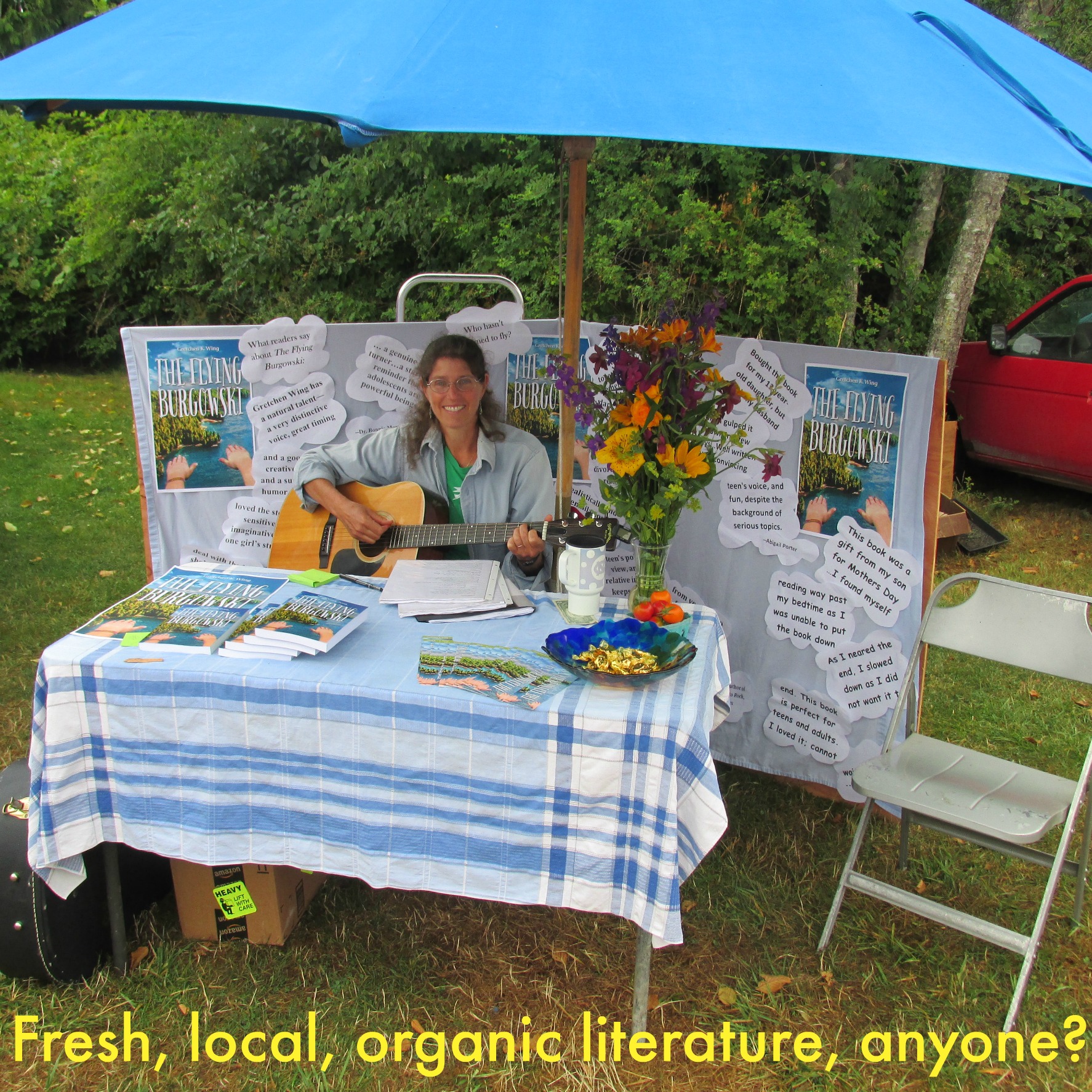 I brought my guitar and sang away, quietly, as people strolled by. Pretty soon I realized the horrible acoustics of the Great Outdoors meant I could sing as loud as I wanted to. Bingo. People heard me, smiled, stopped. The songs provided a bridge between us: no uneasy eye contact (“Oh shoot, if I look at her she’s going to try to sell me something!”). Plenty of time for folks to peruse my display, reading the words from Amazon reviews which I’d enlarged and posted (on fluffy paper “clouds,” since my book’s about a flying girl 🙂 ).