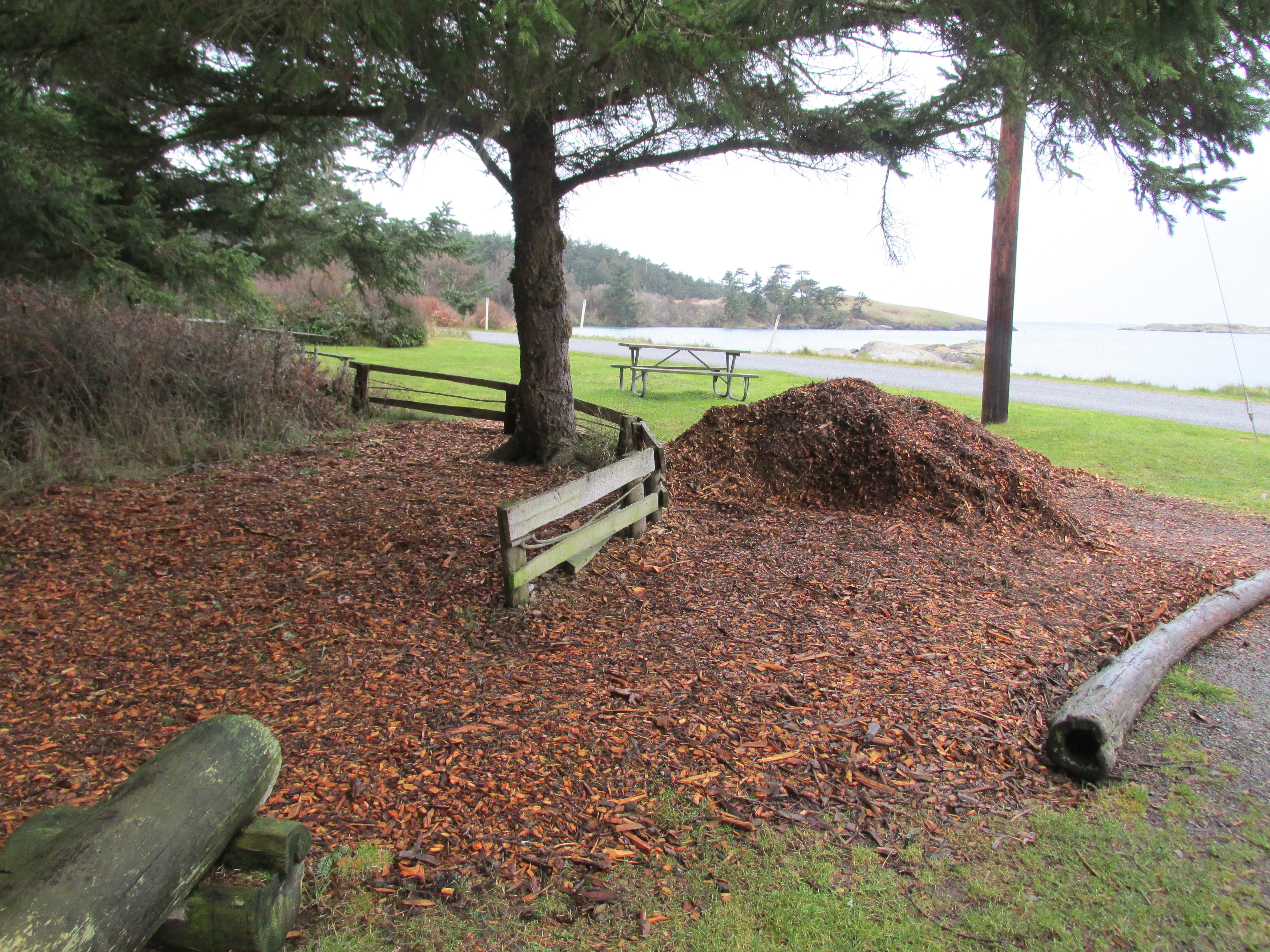 Our island is home to one gentleman whom I have yet to meet, though we’ve been waving to each other in passing. He almost always rides a bicycle, though the other day he apparently drove a pickup…in order to deliver a large load of wood chips, with which to revitalize the paths around the tiny county park down at my end of the island…