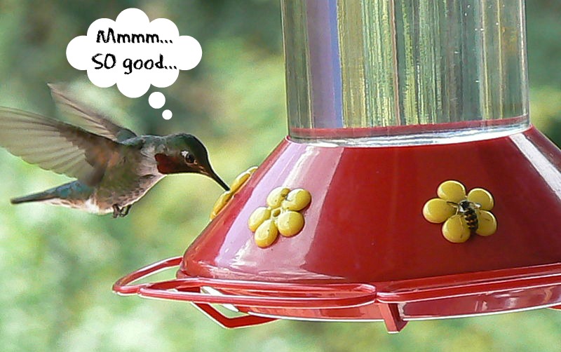But my brain is saying, “Whoa now. Those lil’ guys are sure sucking down that sugar water! They couldn’t possibly get that much sugar from natural flowers, could they? So aren’t they kind of bingeing? Are we loving hummingbirds to an early death by obesity or diabetes?”