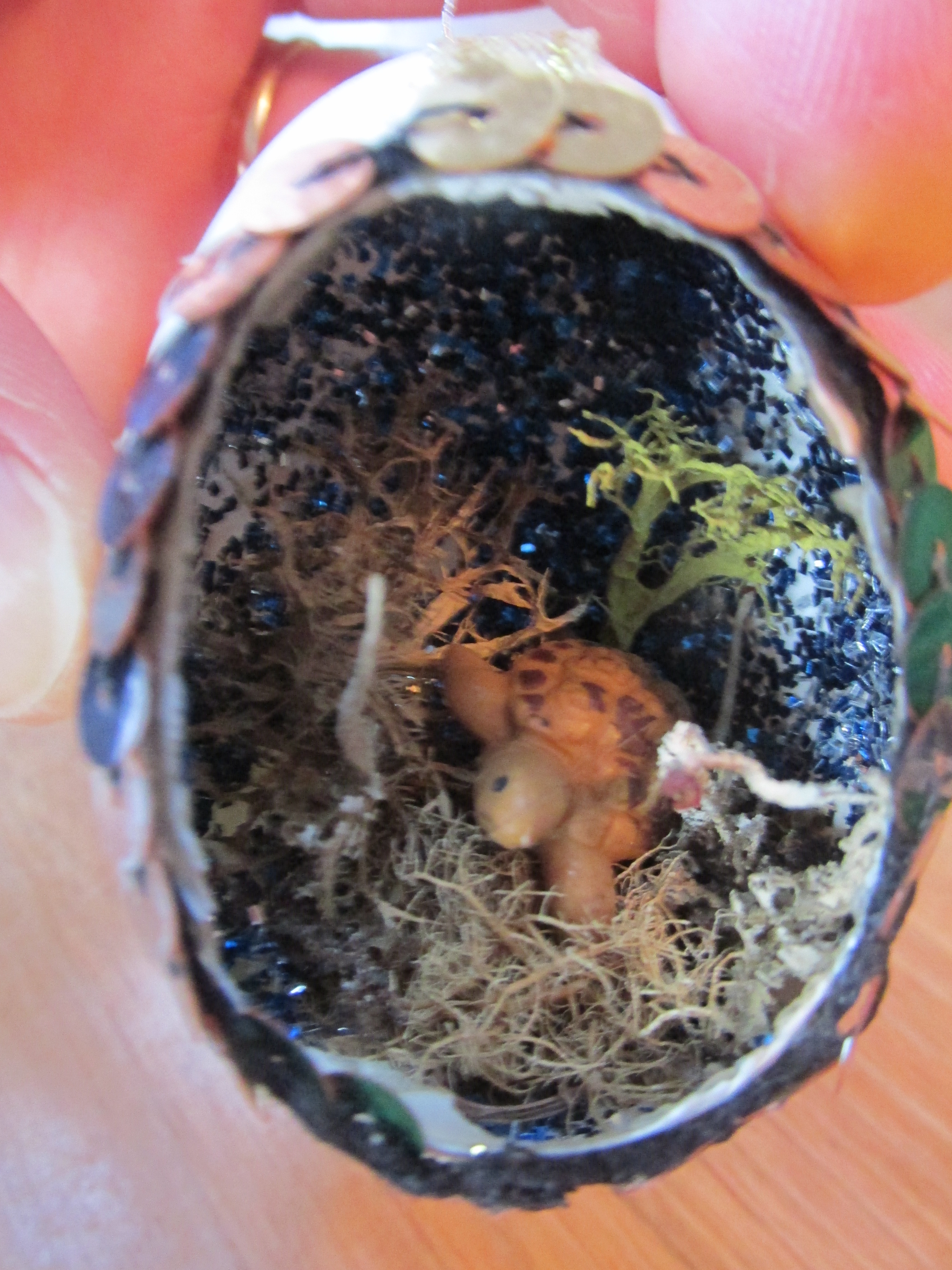 9. Select a piece of lichen of the right size (bush? tree?) and dip its back and bottom into glue. Using the tweezers, gently insert it into the egg. Add other bits of lichen (or moss, or tiny dried flowers) to create your scene.