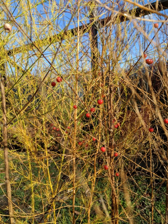 This is, of all things, humble asparagus, gone to berry, and reveling in the afternoon sun.
