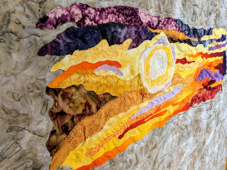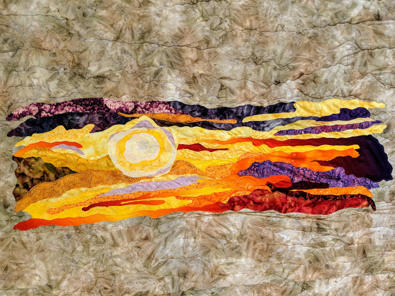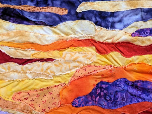 Since this quilt would be blocking our view of the sunset over the water (which, admittedly, we only see between late April and September, before the sun moves south)  I adapted one of Grace’s sunset patterns to place just where the sun would be. I chose my fabrics, cut out every tiny, curvy piece, applied the adhesive on the back, ironed the whole thing, and…