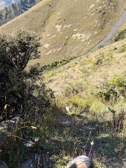 What followed was 40 minutes of all-fours scramble, using tough tussock grass for handholds, trying to avoid taking an unintentional ride on the flinty scree Tim calls “mountain taxis.”