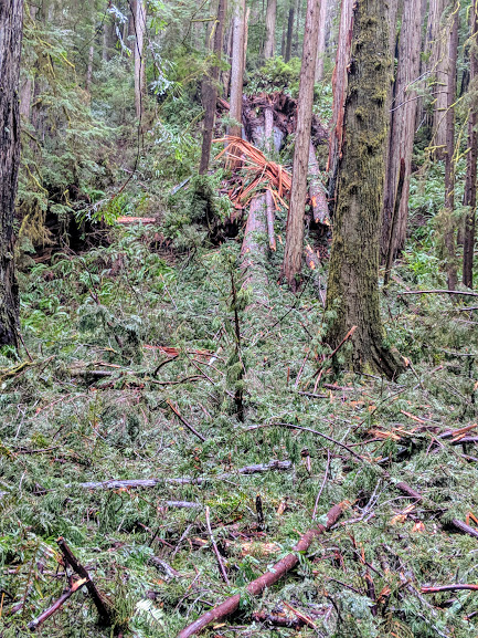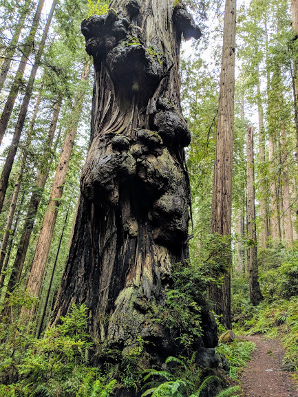 That way we got both a hike AND a bike ride in the big trees. Now, I’ve taken a zillion pictures of redwoods. They’re each so unique, so irresistible! So this time, I tried to focus on other things, like the effects of weather. You always see those old, fallen giants…but we met a newfallen one!