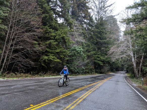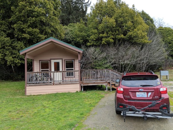But the next day, we were back in one of our favorite environments: the coastal redwoods of Prairie Creek State/National Park. On Valentine’s Day! Because it was too yucky to tent-camp (the only kind we do), we treated ourselves to one of the little, bare-bones cabins there.