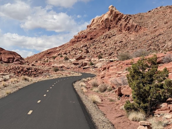 Safely on the other side, temperatures back in the 40s, we took a recreational stop at Grand Junction’s not-so-hidden treasure, Colorado National Monument. We’ve camped there before, and know that its red sandstone towers and hollows and who-knows-what-to-call-its are the equal of anything outside of Arches National Park. We didn’t have the time to go deep into the park, but a single swift hike through the very corner yielded this: