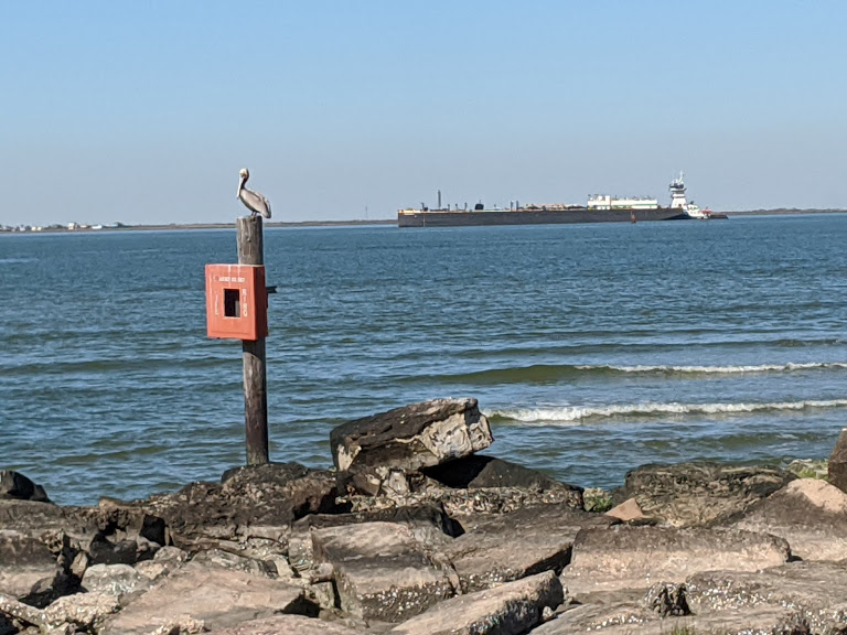 The giant ships entering the harbor, bound for Houston, reminded me of the ones we used to live with during our 20 years in Tacoma. Here there are so many, they line up along the horizon waiting their turn to unload. At night the whole Gulf looks like it’s ringed with stars.