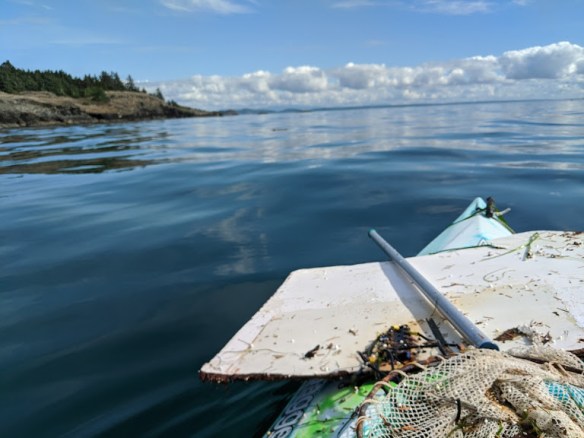 Up close, I found that the barbage gyre was–of course–styrofoam, and most of it had–of course–already crumbled into those tiny, hellish bits. Actually, MOST of it was probably already in the bellies of marine life testing the flavor of those white things. That thought spurred me through the messy task of circling and scooping the gyre.