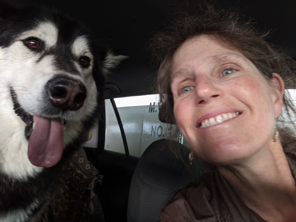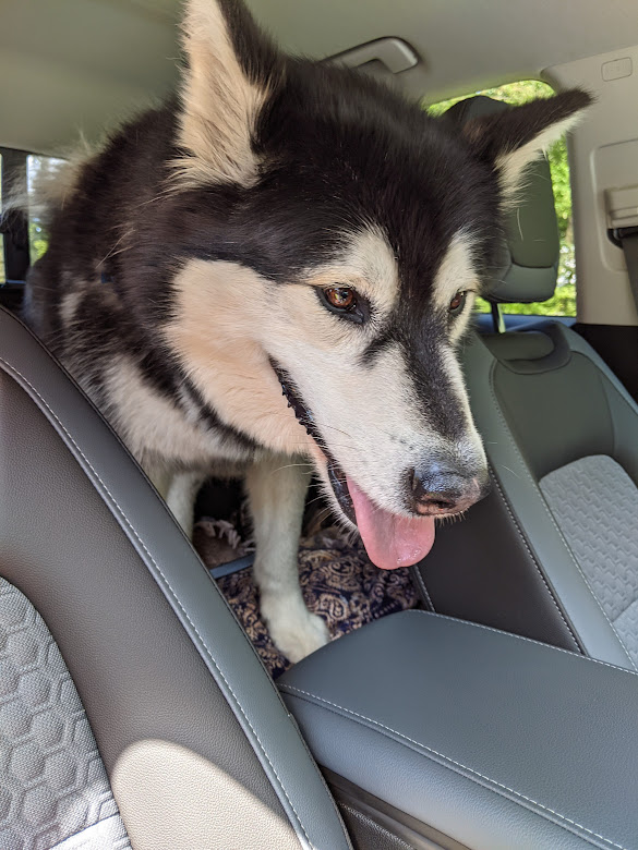 Here’s me, heading out last month in the car of this new hooman Gretchen said was coming to “take me home”…or was it “re-home me”?