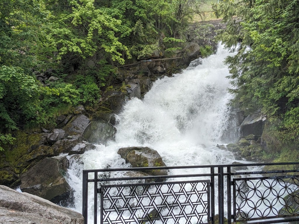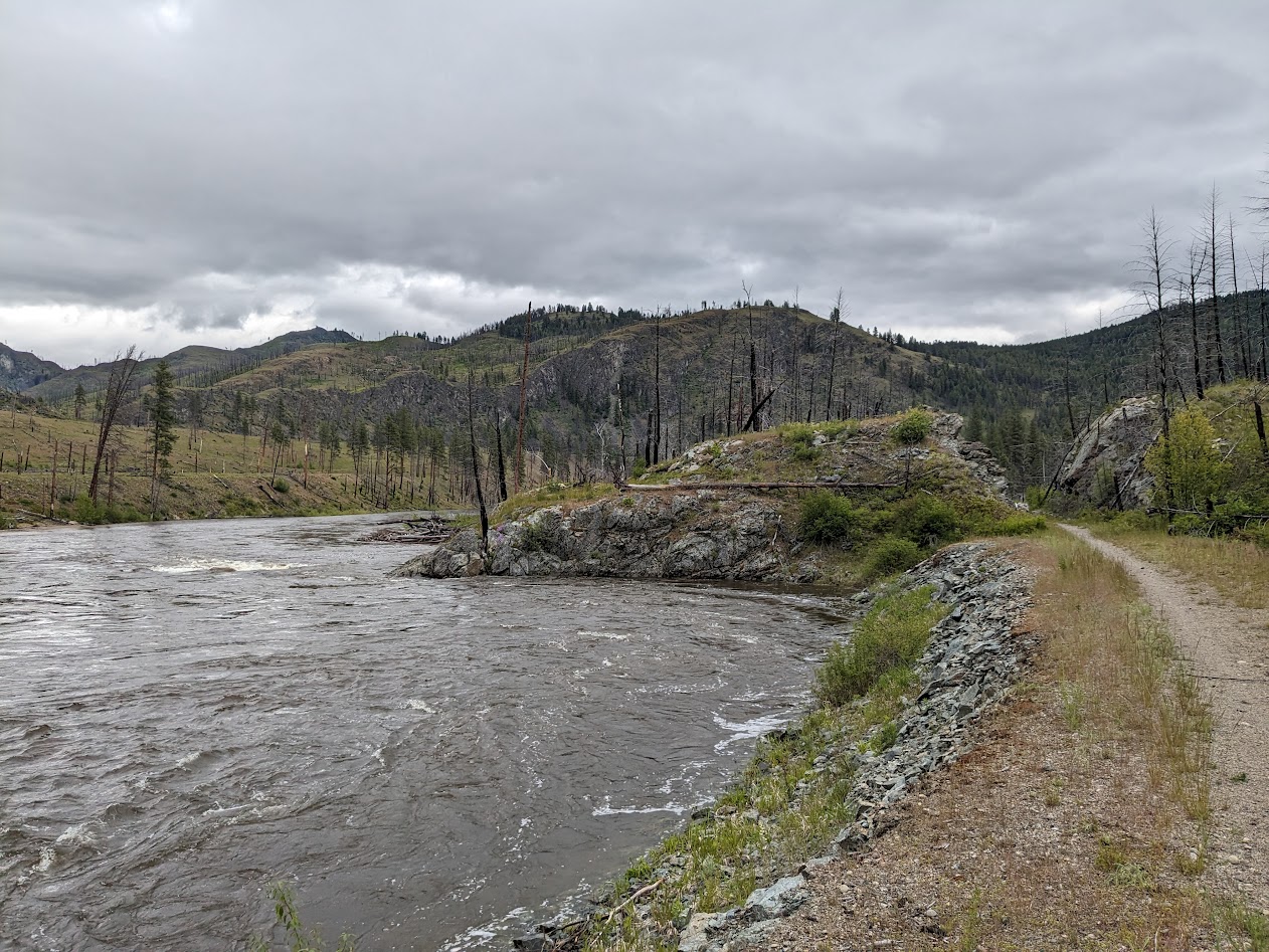 It was nice, next day, to wake up to not-rain. This was our longest driving day, nothing major compared to past road trips, but long for our new campering “normal.” Of course we stopped to ride…on our old friend the Kettle Valley River Trail, this time right along the river itself.