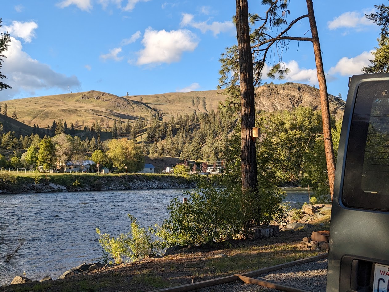 At Princeton, halfway across the province, the sun finally out, we scored a campsite abutting the Similkameen River.