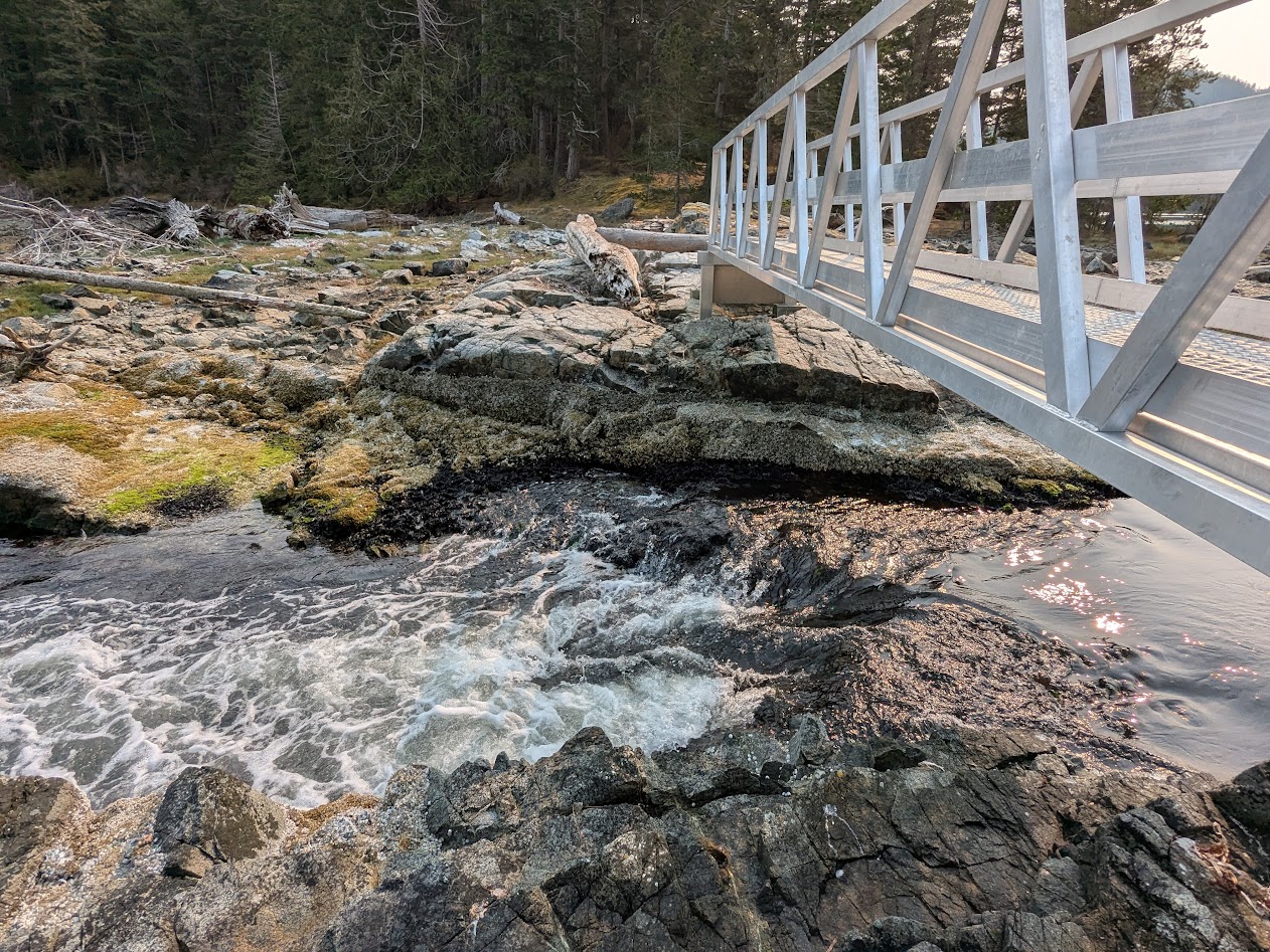 Campbell River–the actual river for which the town is named–is dammed, but not only does it offer the salmon a big side-channel to bypass the dam, it provides guardians for those fish on their passage: