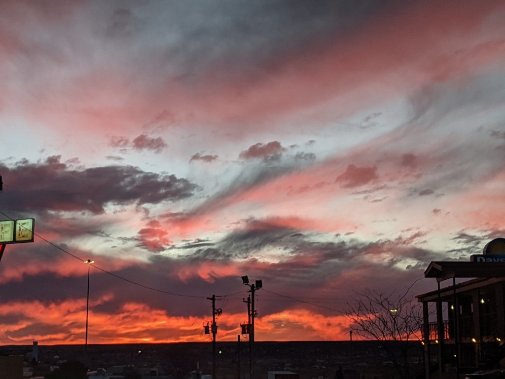 After three fairly rustic days, we were ready for some good WiFi and—because New Mexico!—some good green chiles. (Not pictured: green chiles, blue corn, posole—thanks, NM.) Santa Rosa gave us both, and a decent sunset as well.