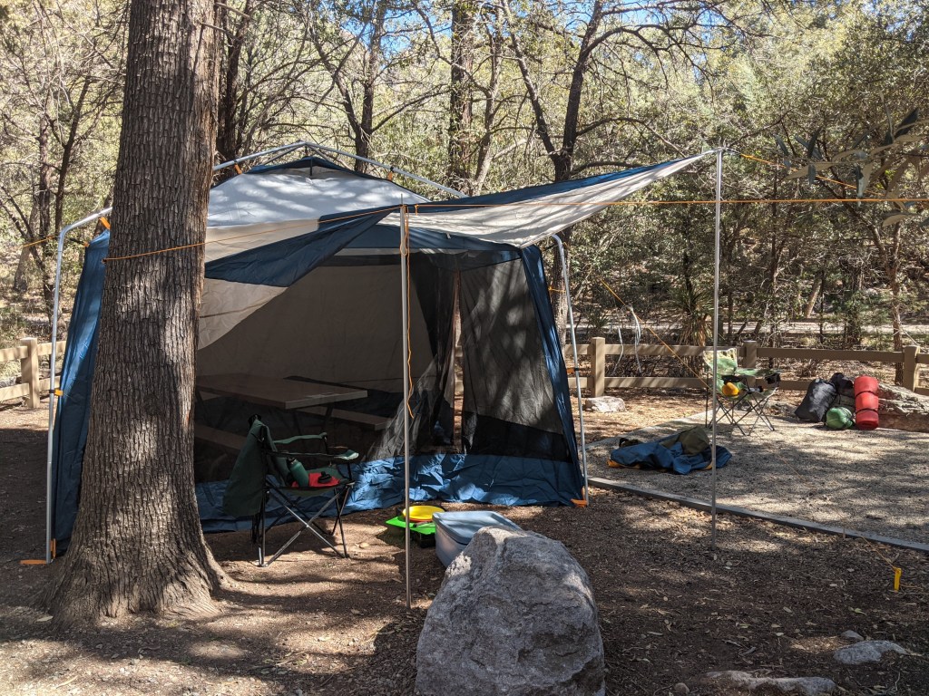 We started on the west side, a.k.a. the National Monument side, or the better-known side, thrilled to have scored one night in small, pretty Bonita Canyon campground. What better place to debut our giant new tent shelter?