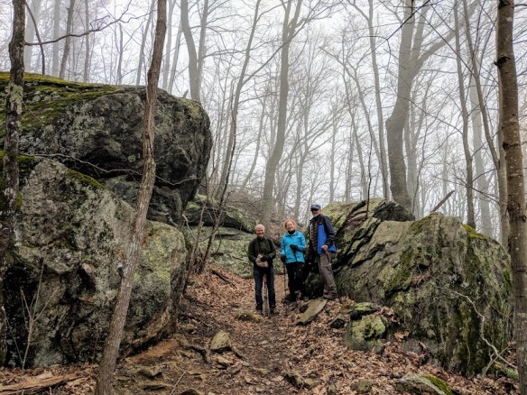 As I headed up the trail, I glimpsed a cliff through the woods, and hearing voices, stopped to look. Of course: a climbing group was gathering at the base. I couldn’t make out their words, but I assumed they were talking about routes, or gear, or who was going to try what. Since I’m a hiker, not a climber, I headed on up the trail, silently wishing them safe fun.