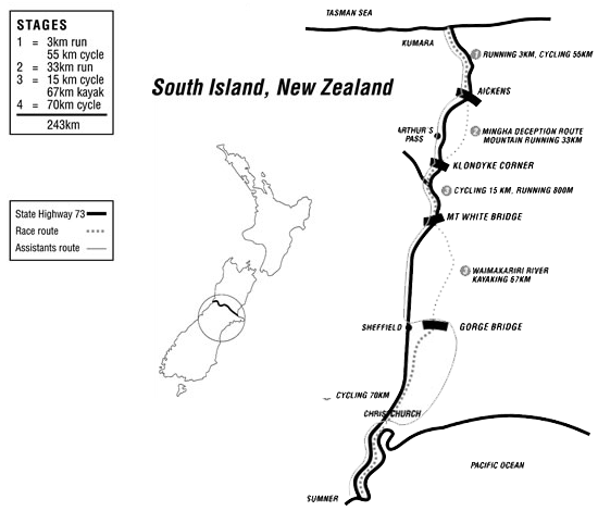 Competitors leave on foot from the black sands and lush windswept landscapes on the West Coast, running 2.2km inland to their waiting bikes. They then follow the Taramakau River 50km to the foothills of the Southern Alps where they switch their bikes for runners and the first true test of the course.