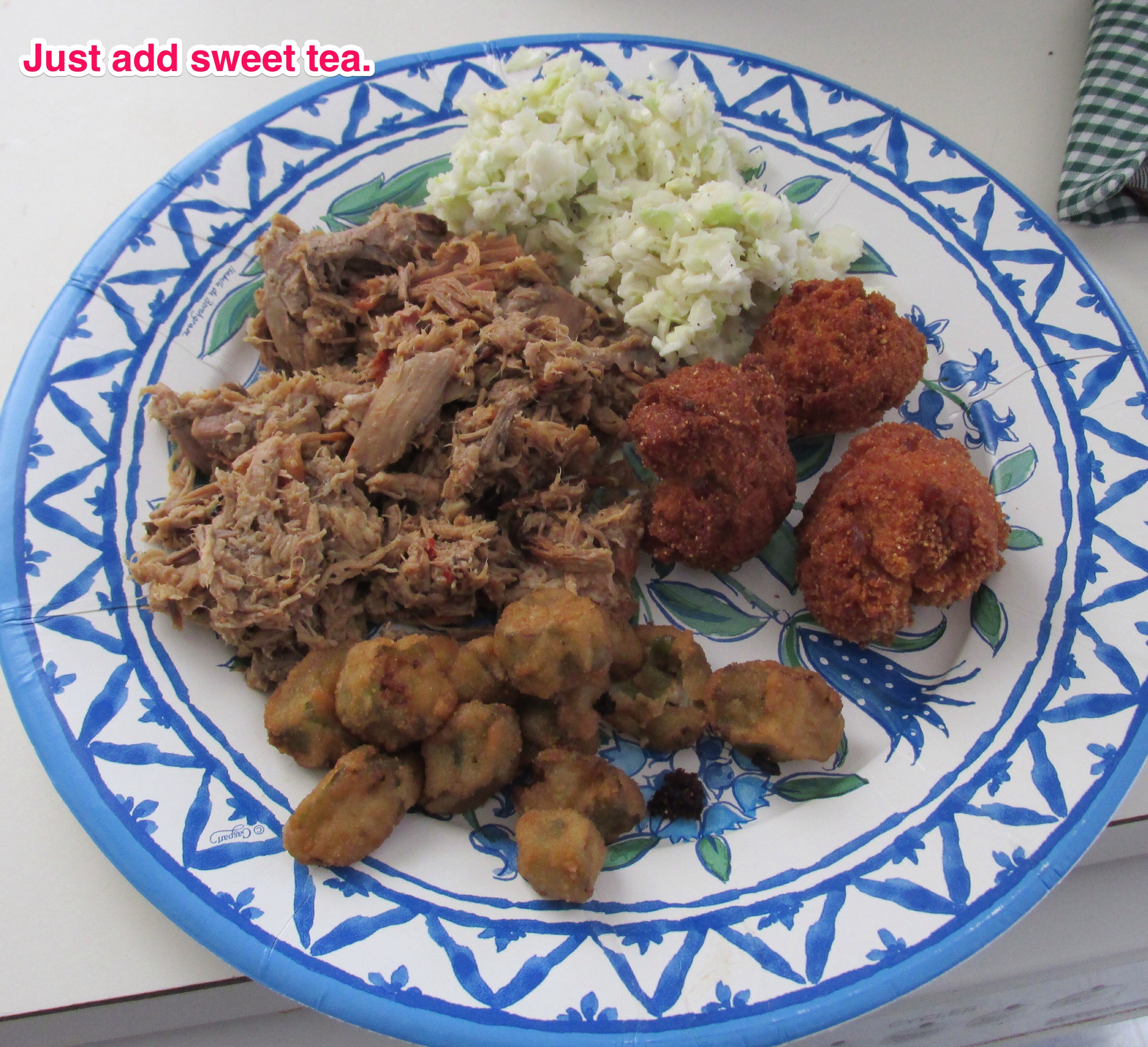 It’s all about the BBQ. With hush puppies, slaw, and fried okra. Not pictured: sweet tea.