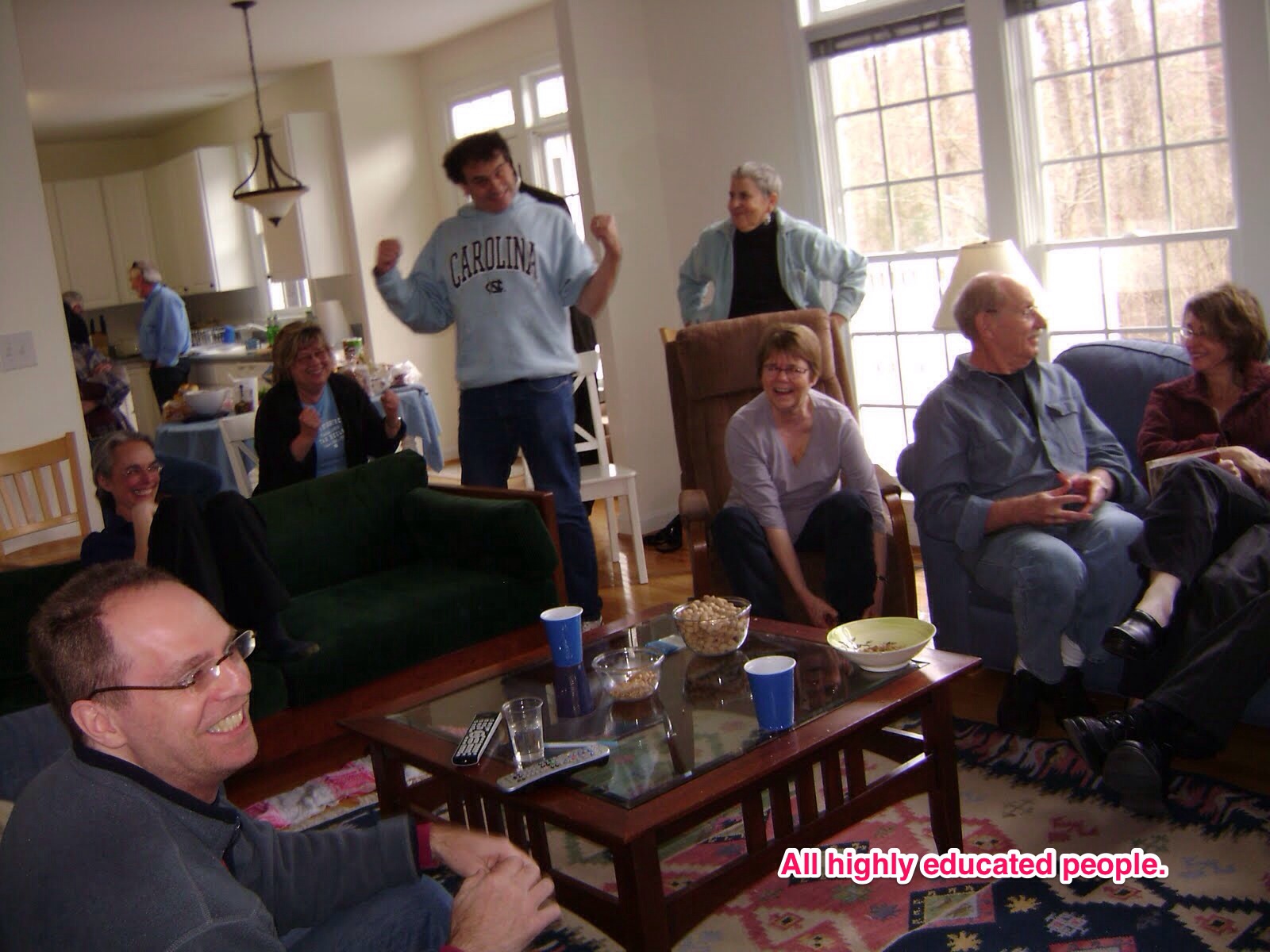 That’s the only way I can explain what happens here in Chapel Hill at our friends Rich and Becky’s house, from Wednesday to Sunday. It starts small, maybe five or six of us watching the games no one really cares about. But by Friday, when Carolina plays, the living room will scarcely hold us. And all these highly educated people–law professors, a former college president, a dean, a member of Obama’s HHS staff, a state legislator–will be screaming at refs, raising our arms during free throws, and doing push-ups during time-outs when the game gets close.