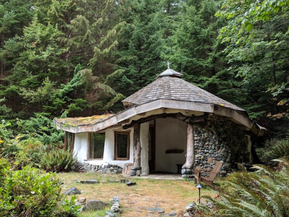 Before then, I’ll share a few pictures from where we stayed. Like Quadra Island, the local provincial parks didn’t provide campgrounds, so we opted for the well-recommended Hollyhock Retreat Center. I mean Centre. It’s famous for multi-day classes in yoga and writing and history and, gosh, just about everything, but you can also just stay there. I was amazed at how reasonable their rates were: $180 per night for two people, with a shared bathroom (which we actually had to ourselves), all meals included. That’s Canadian dollars, so it was really less than $150 U.S.–and the meals alone were worth that! Hollyhock is entirely off-grid and produces nearly all its own pescatarian food. I’m not a taking-pictures-of-dinner kind of person, but here are a couple of shots from their garden, so you can just guess how amazing the food was.