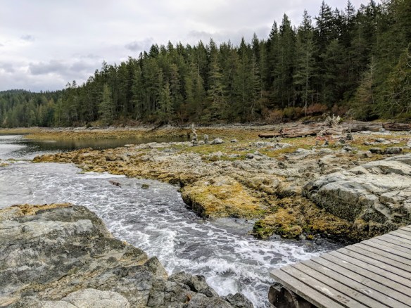 No classes were going on the days we were at Hollyhock, which was fine with us. We just wanted to hike and bike around and get a feel for Cortes, which is what we did. Well–not so much the biking part. It’s VERY hilly there, and the one day we thought we’d try riding on the flatter parts, the wind was blowing 22 mph. But hiking, yes.