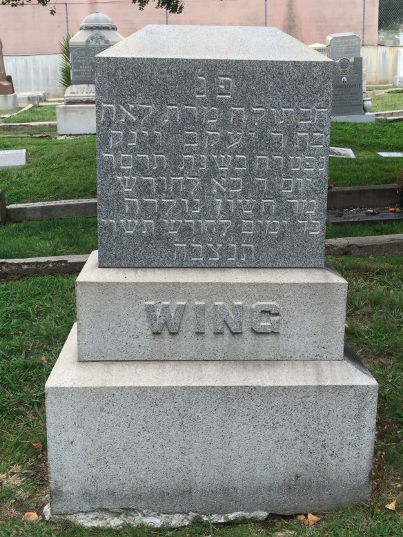 Wing, you see, is not a common last name. In fact it’s quite rare. And it’s certainly not Jewish! So seeing this stone with its Hebrew letters in the Jewish section of the cemetery (anyone else find denominational cemeteries ridiculous?), well…it gave me pause.