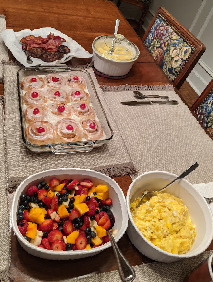 Finally, our friends served us a lil’ ol’ Georgia breakfast: eggs, cheese grits, sausage, bacon, fresh fruit salad, and fresh sweet rolls. Still full from the night before, I made a superwoman effort and ate everything.