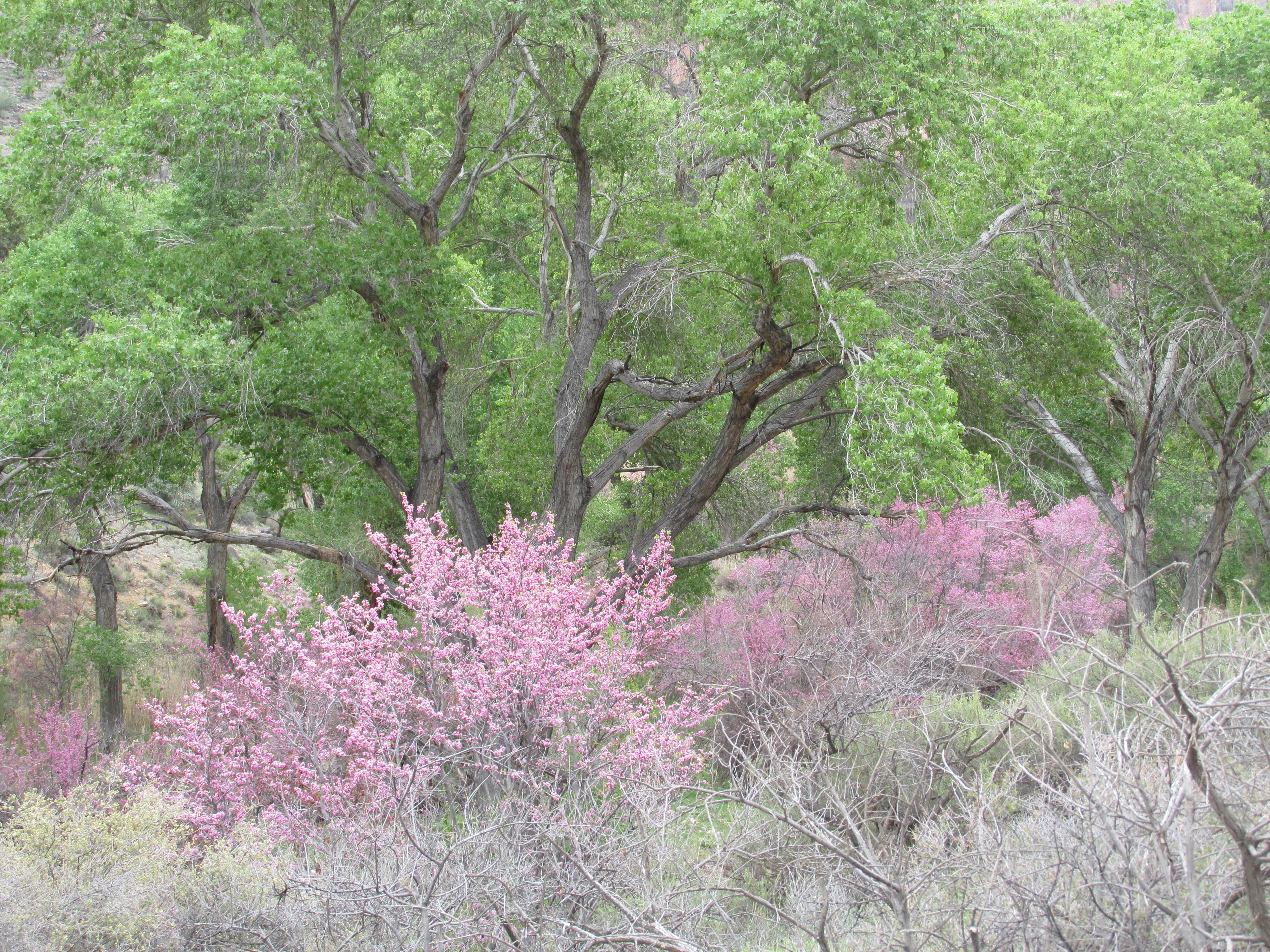 Indian Gardens in March is alive with redbud and fresh new cottonwood leaves.