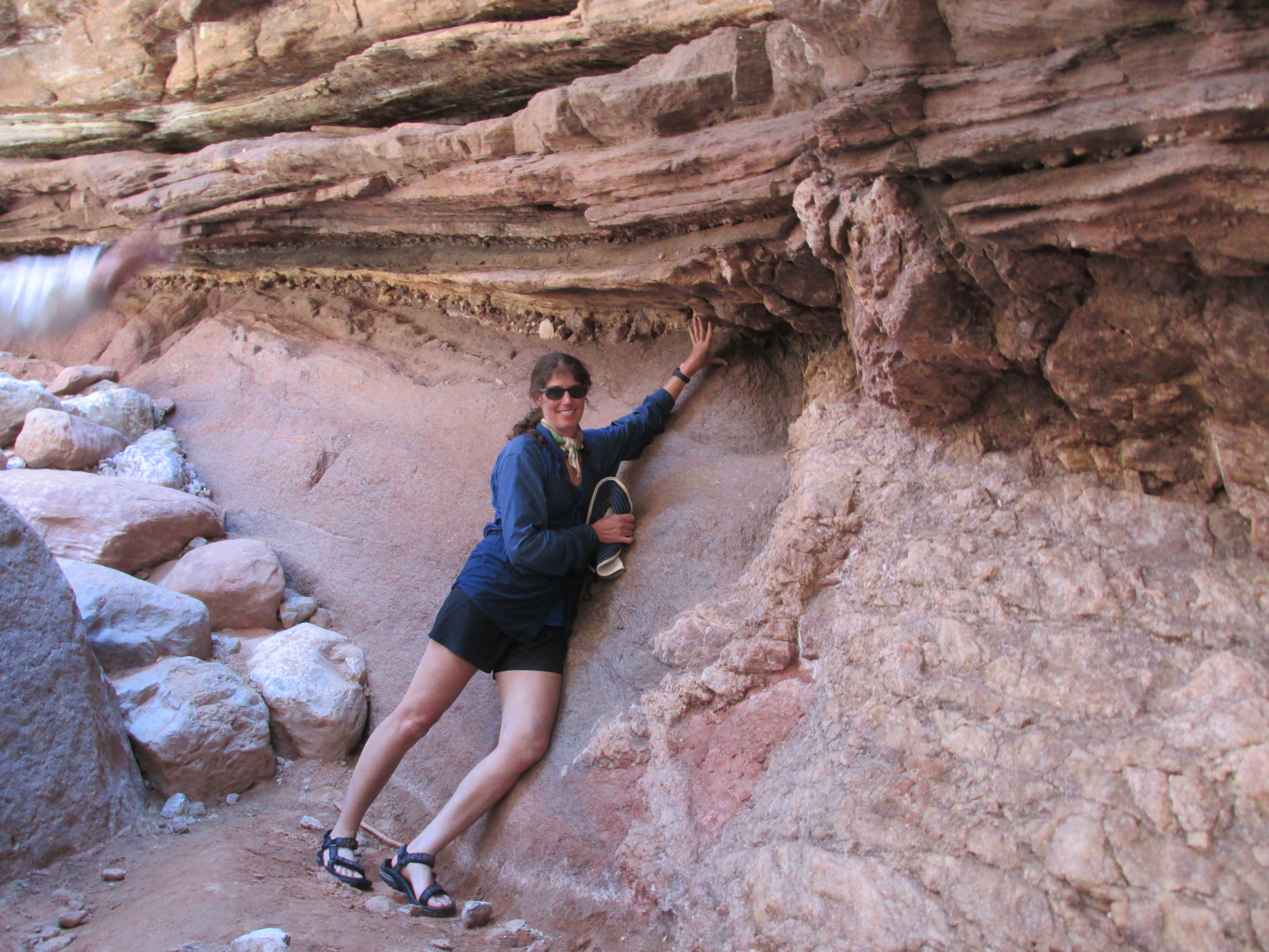If you read my last post, you know how hard I’ve been grooving on Vishnu Schist, the somewhere-around-2-billion-year-old rock at the bottom of Grand Canyon. For all of y’all who aren’t quite as rock-geeky as I am, how about this to blow your minds: in this picture, I am spanning approximately 1,050,000,000 years (that’s 1.05 billion) with my thumb and forefinger: