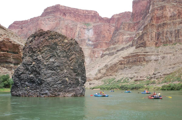 After an hour of the usual red canyon walls, the lava made its appearance. Then, in the middle of the river, Vulcan’s Anvil. I was too busy paddling to take a picture, so I’m borrowing this one: