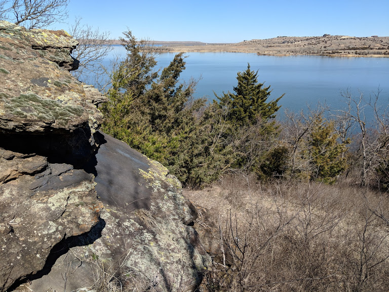 Next day, we had one more sandstone encounter, this time in Kansas. Most of what you see of Kansas from the interstate is fields (pretty unimpressive this time of year), but as you might expect, a few miles off the big roads yields great results. In this case: Wilson Lake State Park.