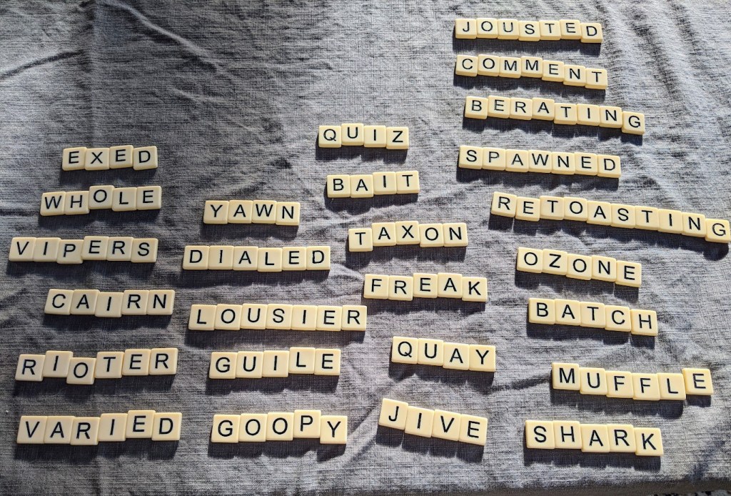 A few rules, of course. Adding letters to existing words requires re-arranging the word. You can’t just make something plural, change “bask” to “basking”, or “world” to “worldly”. You CAN change “bask” to “basket,” or “world” to “whorled.” Or even “latrine” to “relating.”