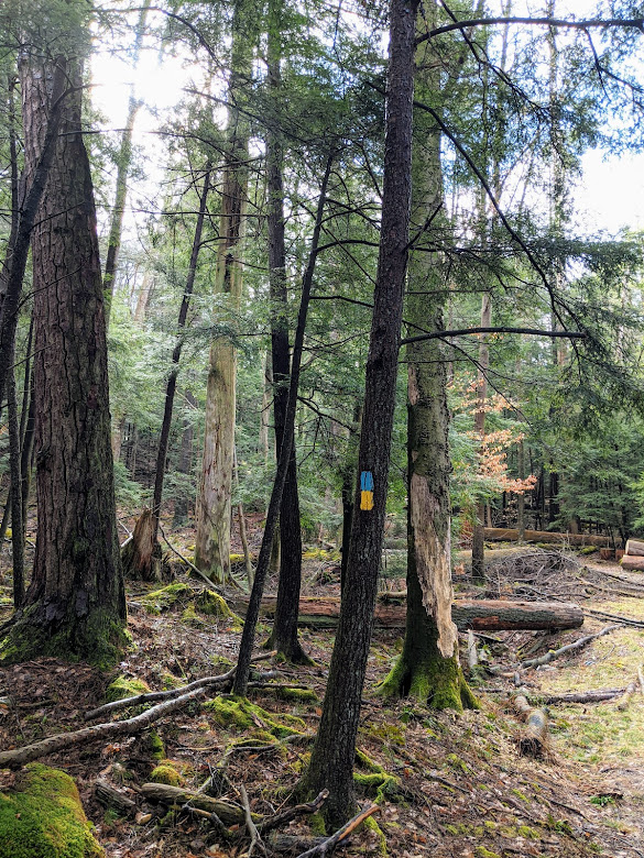 An additional note of poignance amid all the stately forested beauty: the blaze of the main trail happened to be the colors of the Ukrainian flag.