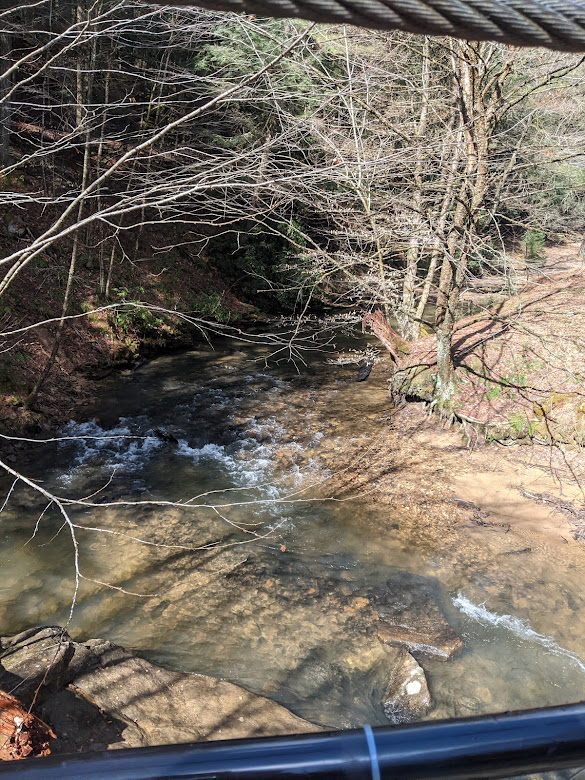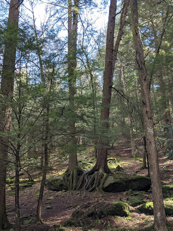 Next day, again–no hurry. We forced ourselves to sleep in, putting sleep in the “sleep bank” for the upcoming, VERY late-scheduled Tarheel game. Our rec stop was Cook Forest State Park, in western PA, which promised a stand of old-growth conifers–something I’ve NEVER seen east of the Mississippi.