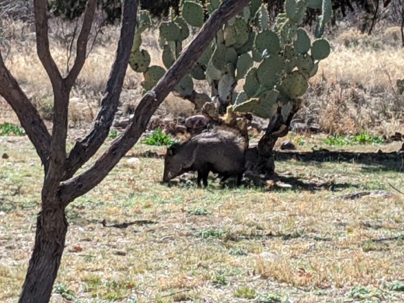 (Gotta admit, this particular piggie disconcerted us a bit. In the past, we’ve only spotted them bolting and scuttling, but this one sashayed through our yard to rub its butt against a prickly pear, then came right up to our cabin like it wanted to order a sandwich. Guess some idiot’s been feeding them.)