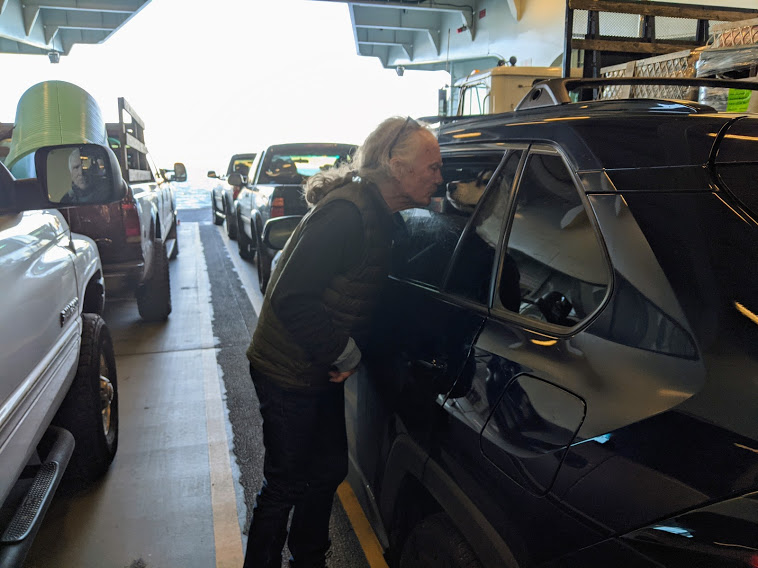 Happiness all ’round. We let the Mate drive, and I directed him toward the Coupeville ferry, the jumping-off point to the Olympic Peninsula. “Don’t worry,” I told Mate & Son, “that ferry’s running. I just checked.”