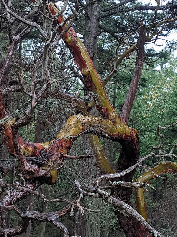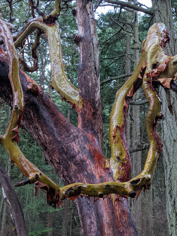 And not just “my” tree–any madrona! Red or green, there’s just something about their surface, more skin than bark, that turns to spotlit satin in the rain.