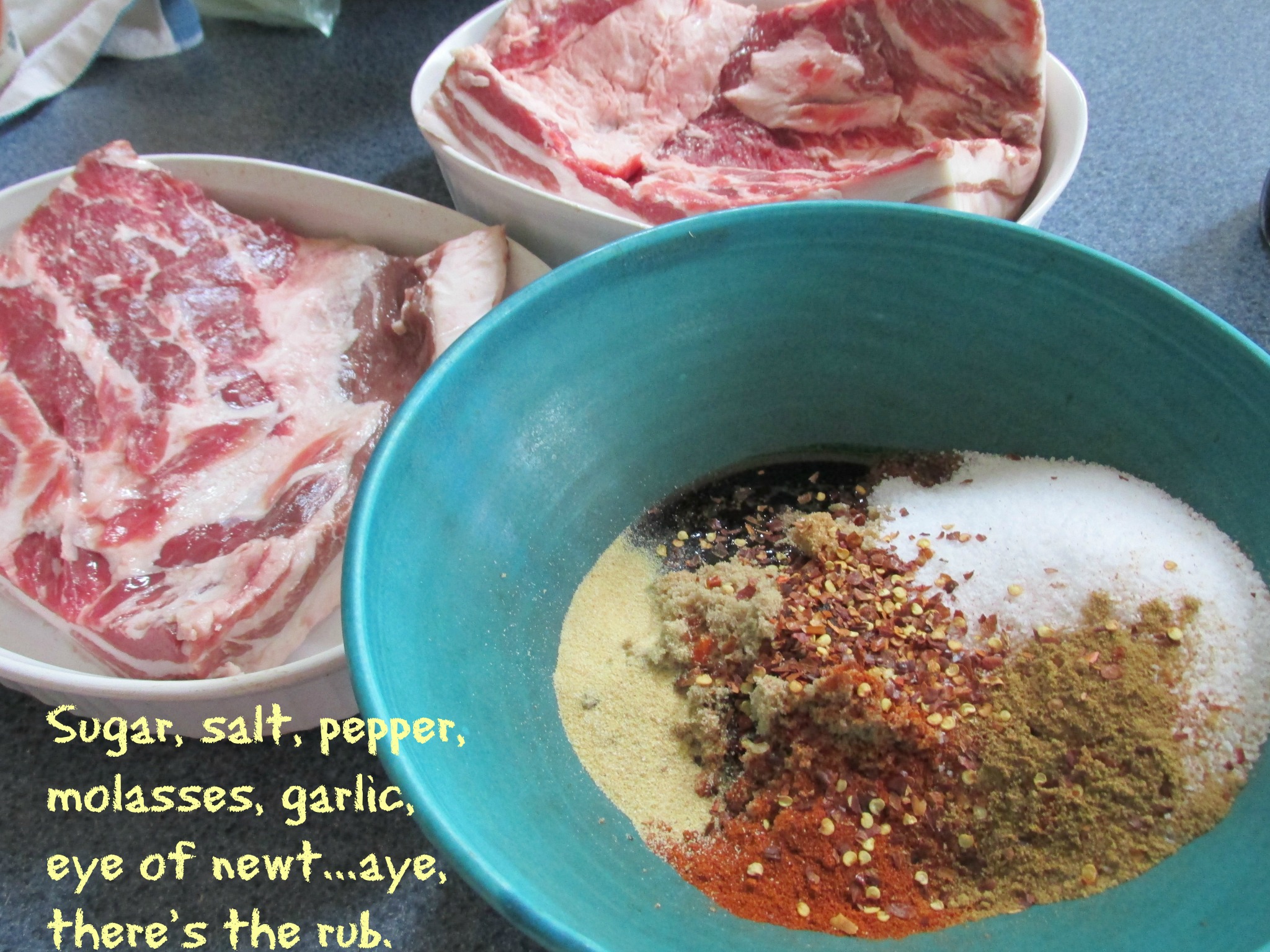 So: game ON. Step One: assemble your rub. (You can do wet or dry; my recipe is a mostly-dry one, though I added extra molasses.) My ingredients: kosher salt, brown sugar, garlic powder, cumin, red pepper. But there are plenty of other recipes on the internet to choose from.