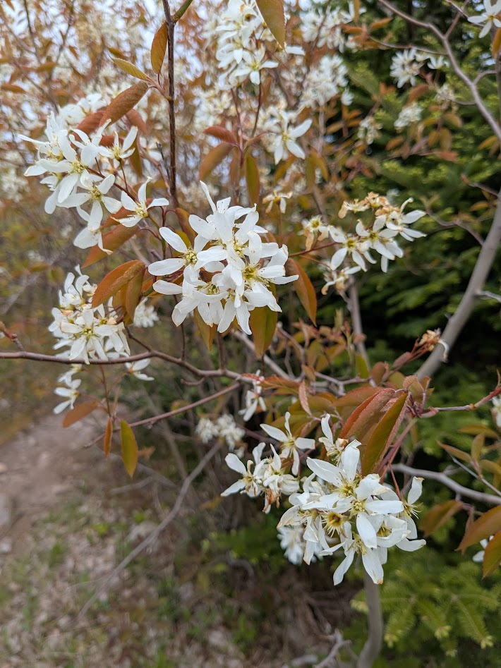 The coastline is quite different on the west side than the east, and the center is also quite distinct. So let me break it down photographically. Two things we did see everywhere: blooming serviceberry…